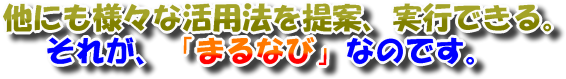 「まるなび」を活用して、知らなかった街の情報を得る。新たな発見があるから、好きな街を更に好きになれる。それが「まるなび」本来の役割。 「こんな所に、こんなお店あるよ」とか「こんなお店もあったんだ」なんて、知られていない情報を発信したり、新しい情報を得たり。これからの街とのお付き合いに、是非「まるなび」をご活用下さい。 |
